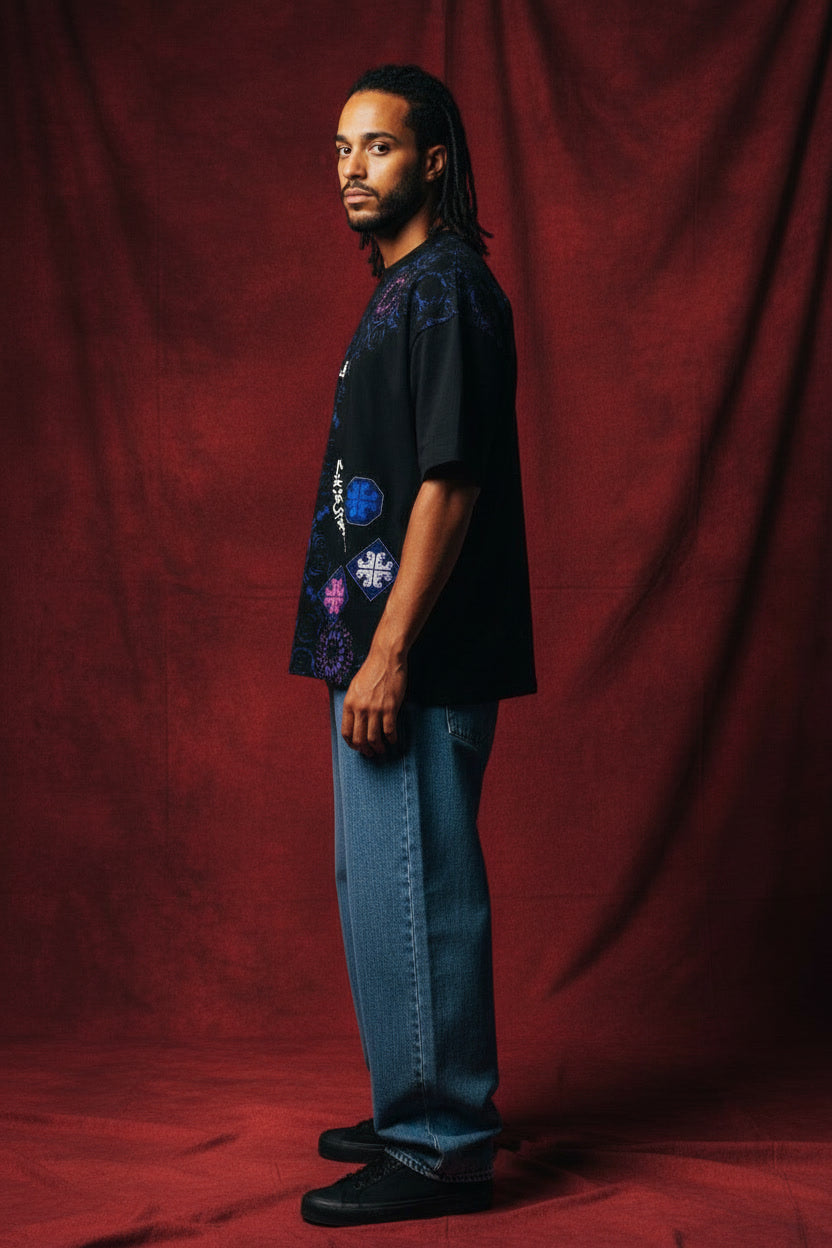 Front: Features a split-design aesthetic with repeating violet mandala patterns on the right and a minimalist black panel on the left with hand cut patches.