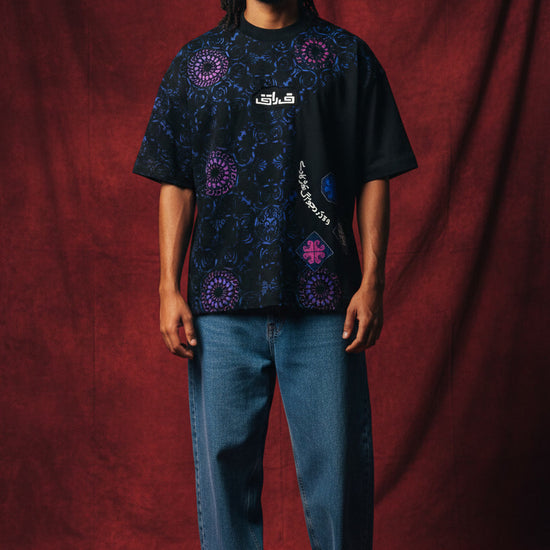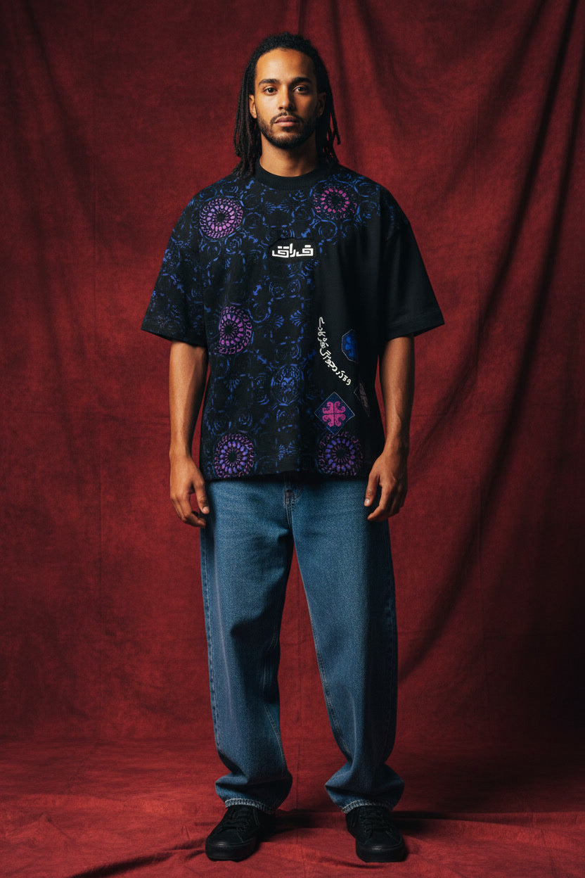 Step into a narrative of art and identity. This hand-printed masterpiece features intricate blue and violet mandalas, juxtaposed against bold Urdu typography patch. The word "Firaaq" (فراق)—signifying longing or separation—is centered as a focal point, while flowing script circles the back in a dance of traditional calligraphy.