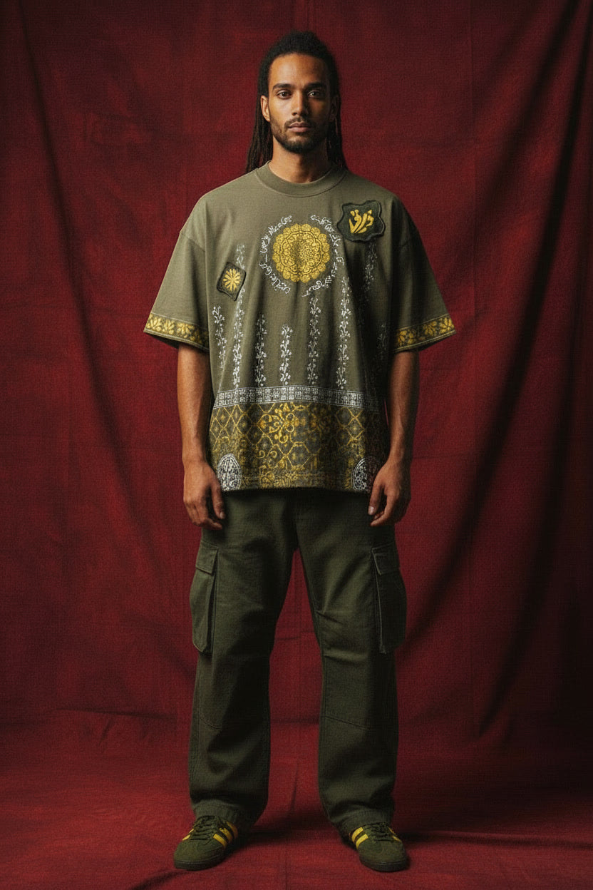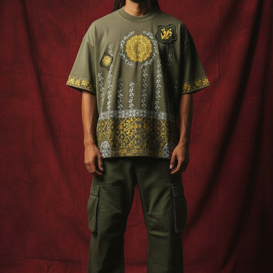 This olive-toned masterpiece is an ode to the gardens of the past. Featuring hand-printed floral vines that climb like ivy, the design is centered by a golden sun-like mandala with urdu poetry calligraphy. On the reverse, a sprawling 'Tree of Life' blooms in ivory and gold, symbolizing growth even in the silence of separation. A garment that feels less like clothing and more like a heritage heirloom."