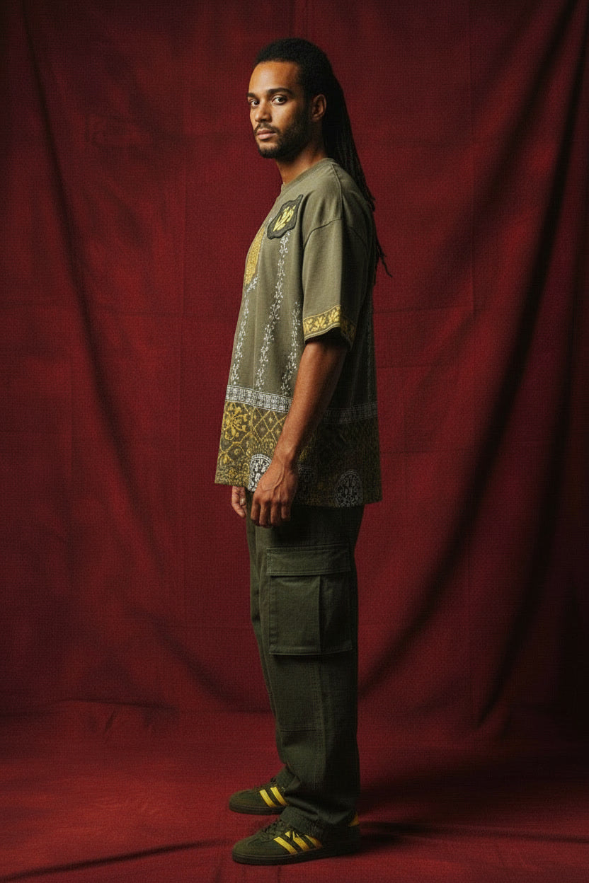 Front Detail: Features a central circular script emblem surrounded by vertical hand-printed floral "bel" (vine) patterns and a structured geometric border at the hem.
