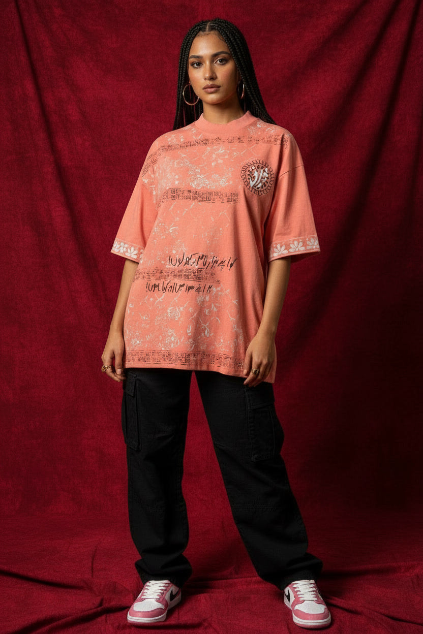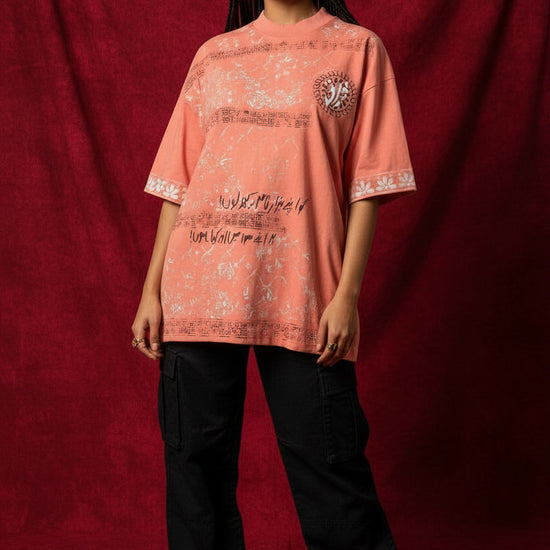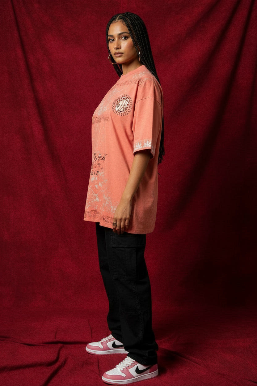 A canvas painted with the hues of a setting sun. This terracotta-peach oversized tee is an ode to the wandering soul. Featuring weathered, sand-blasted damask patterns and scrolls of ancient calligraphy, it feels like a fragment of a lost map discovered in the dunes. The delicate white floral borders at the sleeves provide a touch of architectural grace to a garment that is as much a piece of art as it is a statement of style.