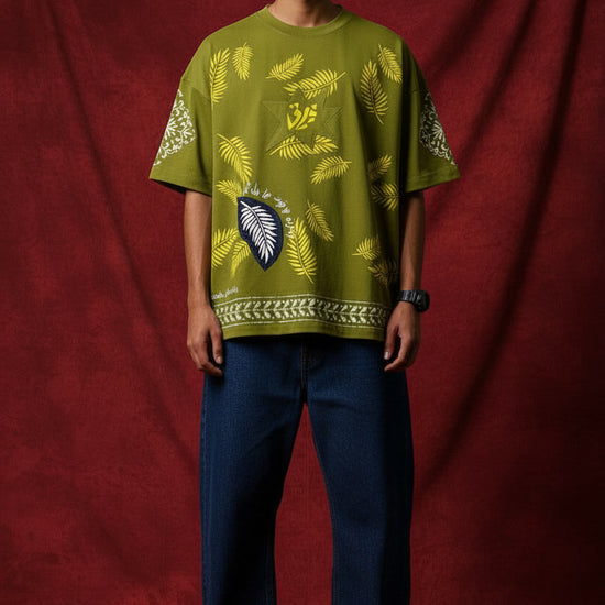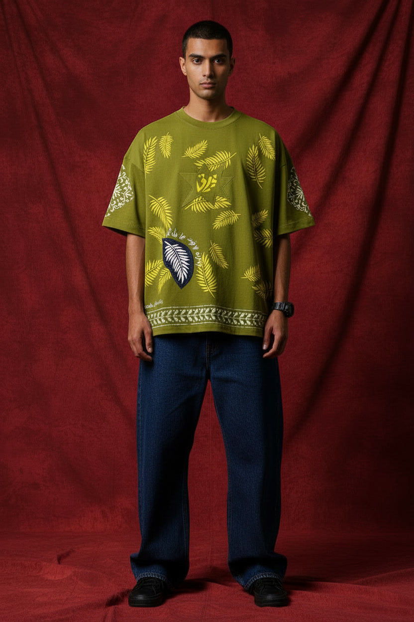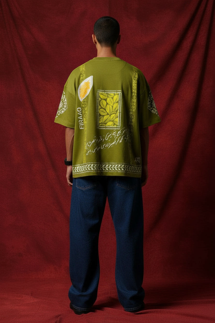 Back Detail: Features a structured rectangular leaf-print patch, white "Firaaq" vertical branding, and flowing calligraphic verses.