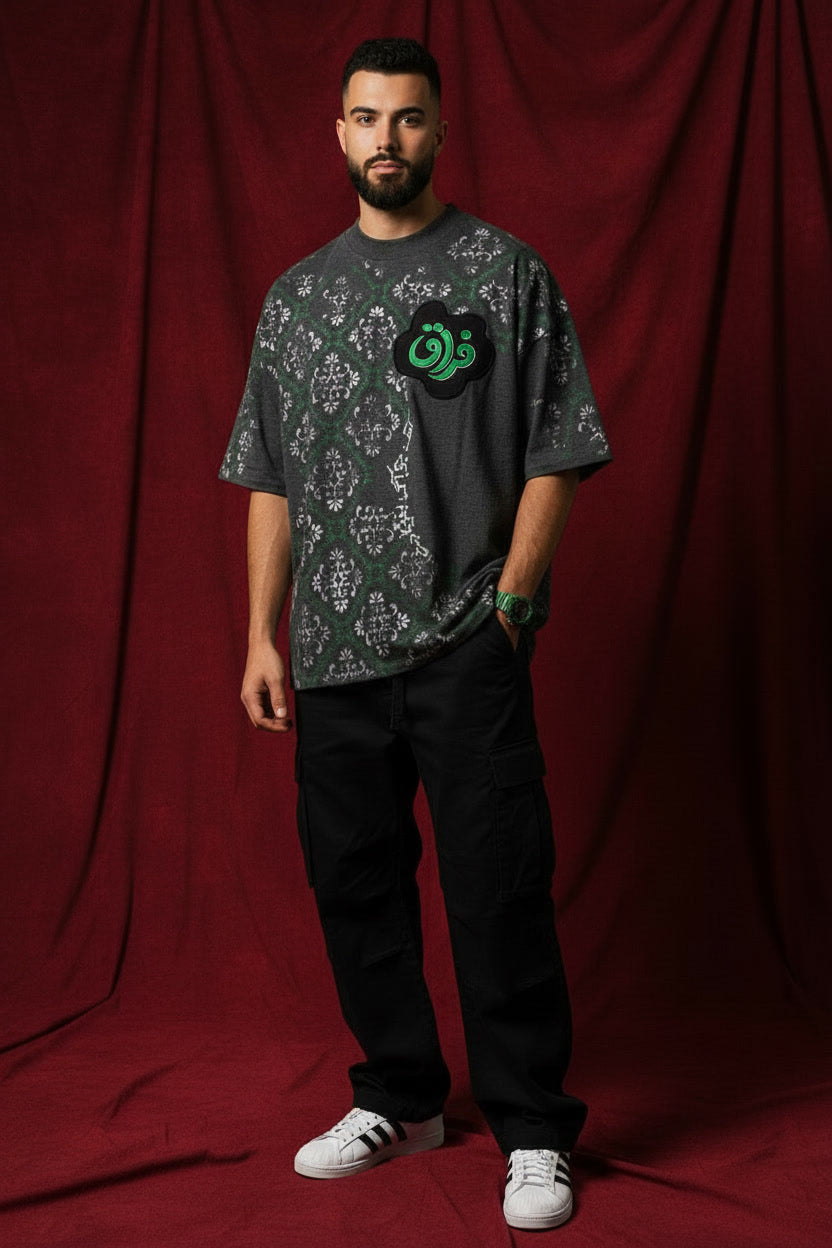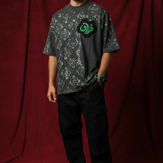 "Inspired by the oxidation of ancient copper and the resilience of nature in urban spaces, this piece is a study in subtle contrast. The charcoal base serves as a heavy, industrial canvas for hand-printed damask motifs that appear to climb the fabric like moss on stone. The vibrant green 'Firaaq' cloud-patch on the chest is the heartbeat of the design—a bold declaration of identity amidst the shadows."
