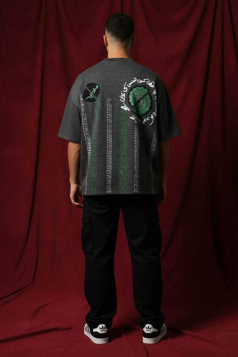 This charcoal grey unisex tee offers a masterclass in industrial elegance, blending raw textures with classical calligraphic refinement. This piece acts as a bridge between the collection's ethereal "Aks-e-Aasman" and the grounded "Bel-e-Kohan".